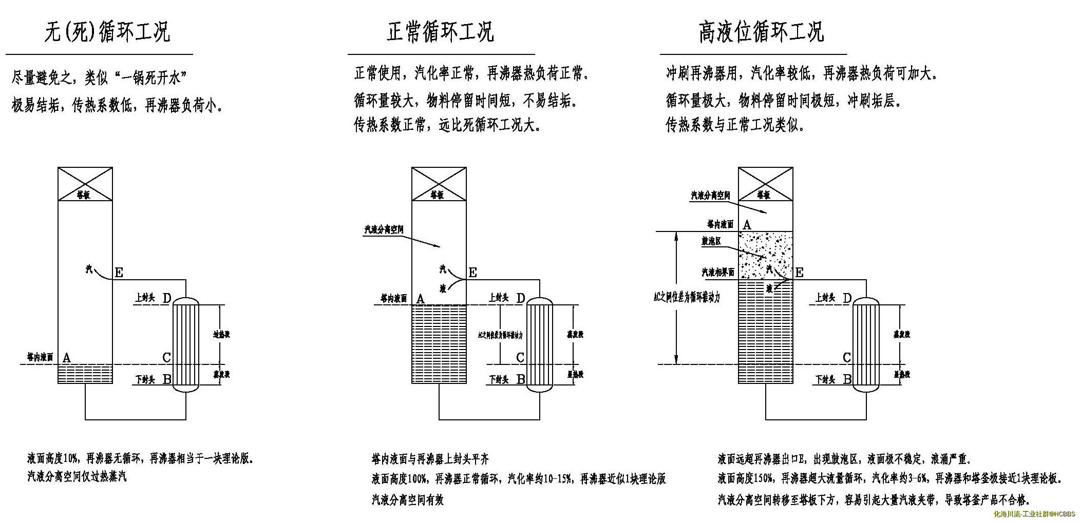 4.之所以能产生热虹吸,就是因为在蒸发段,由于汽化,汽液两相流密度降低,使得AC之间的液位差形成的推动力足以推动汽液两相流能自高于塔内液面A的E口流出,这就是虹吸现象在工业中的典型应用,所以AC间位差越大,即液位越高,循环量越大,再沸器的热负荷还可提高,对循环而言,是大有好处的,但凡事有一利必有一弊,过高的液位会使液面出现浪涌,因为有了鼓泡区(水壶烧开了鼓的泡有多大?这是生活常识),使汽液分离空间减少,雾沫夹带严重,最严重时会使上层塔板效率下降,产品不合格,因此是非正常情况下才使用的一种手段。