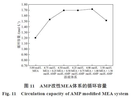 综合考虑AMP对于体系吸收和解吸的影响,通过循环容量比较了各体系的CO2 捕集性能。不同AMP比例的混合醇胺体系的循环容量如图11 所示。