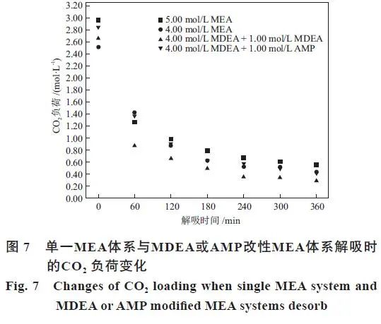 相同时间下,混合醇胺体系解吸的CO2 负荷较5.00 mol/L MEA体系更低,贫液负荷有所降低。其中,MDEA改性体系的贫液负荷最低,相同时间达到的CO2 负荷更低,解吸性能更优。AMP的加入同样对混合醇胺体系的解吸有着促进的作用,较5.00 mol/L MEA体系降低了24.47%的贫液负荷。MEA与CO2 反应生成稳定的氨基甲酸盐,在其逆过程解吸中需要吸收更多能量,而MDEA和AMP反应生成碳酸氢盐,解吸较氨基甲酸盐容易。因此,改性剂的添加可以更快地达到较低的吸收负荷,从而降低解吸能耗[22]。合适的改性剂在提升体系吸收性能的同时,还可优化体系的解吸性能,AMP的加入使得体系的解吸更快进行。不同CO2 体积分数下,采用不同吸收胺体系,对于低浓度CO2 的吸收,富液负荷较纯CO2 吸收均减少,在5% CO2 体积分数下,AMP改性体系吸收性能较5.00 mol/L MEA体系更优;在解吸方面,改性体系较5.00 mol/L MEA体系更优。