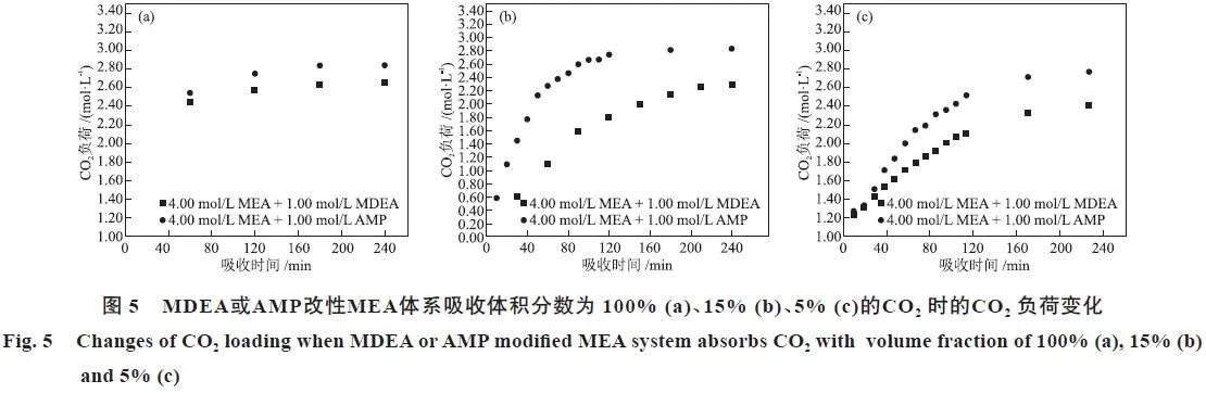 MEA体系存在溶液易分解、再生能耗高等问题[19-20],改性剂与MEA之间的交互作用会对吸收过程产生影响[14,17]。为了探究改性剂对于MEA体系性能的影响,实验测定了MEA与AMP、MDEA混合的改性体系在3 种CO2 体积分数下的CO2 负荷,结果如图5 所示。在吸收纯CO2 时(图5(a)),两种改性体系吸收性能相近,均表现出较高的吸收速率,介于4.00 mol/L MEA和5.00 mol/L MEA之间。在吸收15% CO2 时(图5(b)),4.00 mol/L MEA+1.00 mol/LAMP的吸收速率大于4.00 mol/L MEA+1.00 mol/LMDEA,与吸收100% CO2时保持一致,其中,4.00 mol/L MEA+1.00 mol/LMDEA的CO2 负荷低于4.00 mol/LMEA。由此推断,在吸收低浓度CO2 时,加入的MDEA对于体系吸收性能起负面作用,而AMP的加入对CO2 的吸收有促进效果。当CO2 体积分数降低至5%时(图5(c)),此时AMP改性体系的CO2 负荷较5.00 mol/L MEA和4.00 mol/LMEA体系,分别提升了30.55%和62.07%。在低浓度CO2 下,AMP有着更好的吸收表现[21],通过加入AMP改性,在吸收CO2体积分数为5%的气体时,MEA和AMP的混合体系有着更为优异的表现。