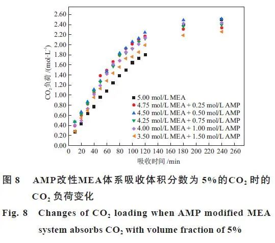 (2)AMP改性后的混合醇胺体系,具有优异的吸收性能,在吸收体积分数为5%的CO2 时,富液负荷较原5.00 mol/L MEA体系提升了30.55%,并且解吸速率更快,贫液负荷降低了24.47%。