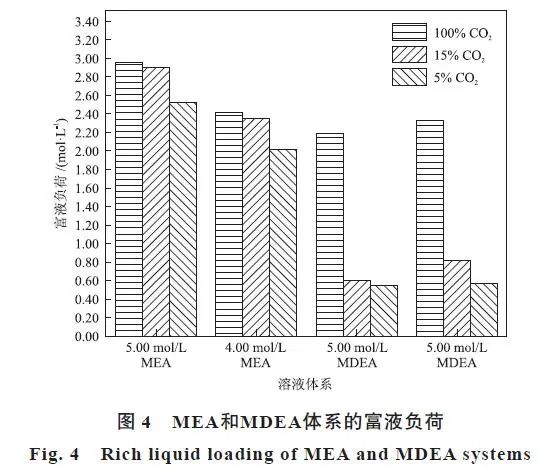 由图4 可见,在吸收低浓度CO2 时,吸收饱和时的富液负荷,相比于吸收纯CO2 会有一定程度的降低,MEA体系富液负荷降低较少,而MDEA体系富液负荷降幅明显,仅能保持吸收100% CO2 时富液负荷的30%左右。可见,在吸收低浓度CO2 时,无论是吸收速率还是富液负荷,MEA体系的吸收性能均优于MDEA,对于低浓度CO2 的吸收有着较好的研究价值。