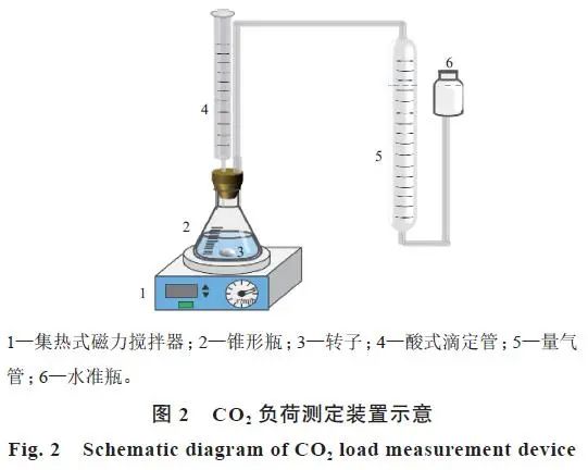 图2 所示为溶液的CO2 负荷测定装置。实验装置由磁力搅拌器、锥形瓶、酸式滴定管、量气管与水准瓶组成,待测定液体置于锥形瓶中,由酸式滴定管滴加1.00 mol/L的稀硫酸,通过磁力搅拌器混合待测液体和稀硫酸。如图2 连接实验装置,检测气密性,在装置气密完好不漏气后,向锥形瓶中加入体积为Vsol待测吸收剂,盖好瓶塞。通过调节水准瓶,使水准瓶中液体高度与滴定管中液面高度一致,记录此时量气管液面高度V1 和滴定管中液面高度V2。打开磁力搅拌器,向锥形瓶中缓缓滴入稀硫酸,与待测吸收剂反应排出CO2。待量气管中液面稳定后,调节水准瓶至其液面高度与量气管中液面高度一致,记录此时的量气管液面高度V3 和滴定管中液面高度V4 以及环境温度t。