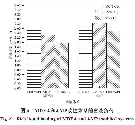 图6 是MDEA和AMP改性体系的富液负荷。由图6 可知,MDEA和AMP改性体系在吸收低浓度CO2时,与100% CO2 吸收负荷相比,均有一定程度的降低。其中AMP改性体系由于CO2 体积分数降低带来的容量损失较小,且在CO2 体积分数为5%时,与单一MEA体系相比,AMP改性后的混合醇胺体系CO2负荷有所提高;AMP改性体系低浓度CO2 吸收性能较MDEA改性体系更优,更适用于低浓度CO2 吸收。