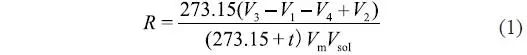 式中,R为CO2 负荷,mol/L;V1 为滴定前量气管内液体体积,mL;V2 为滴定前滴定管中的液体体积,mL;V3 为滴定后水准瓶与量气管中液面高度一致时量气管内液体体积,mL;V4 为滴定后滴定管内液体体积,mL;t为滴定时环境温度,°C;Vm为气体摩尔体积,22.4 L/mol,Vsol为待测液体积,mL。
