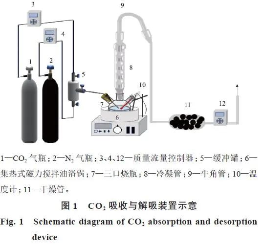 图1 所示为CO2 吸收与解吸实验装置。实验装置由CO2 与N2 气瓶、质量流量控制器、缓冲罐、反应容器、冷凝管、集热式磁力搅拌油浴锅和干燥管组成。实验中气体通过气瓶存储,由质量流量控制器控制其流量,进入三孔烧瓶中与吸收液反应,反应后的气体通过冷凝管、牛角管等进入干燥管干燥,由质量流量控制器量取其流量。吸收实验前量取新制的100 mL吸收液,装入三口烧瓶中,将系统加热至40 °C,期间系统通入N2,流量为200 mL/min,待系统稳定后通入特定体积分数的CO2(100% CO2、15% CO2+85% N2、5% CO2+95% N2),总流量为1200 mL/min。实验过程中,间隔固定时间取样1 mL,每次取样后重新加入新制的溶液1 mL,保证体系溶液体积不变。待入口与出口气体流量小于5 mL/min时,视为体系反应平衡,CO2 吸收至饱和。待吸收实验溶液吸收至饱和,停止通入CO2,将体系温度升至100 °C,进行解吸实验。取样与吸收实验操作一致,实验全程在常压状态下进行。实验过程中的气体流量由质量流量控制器(ADmass型,北京弗罗斯科技有限公司)控制,温度由集热式磁力搅拌油浴锅(DF-101S型,上海力辰仪器科技有限公司)控制。