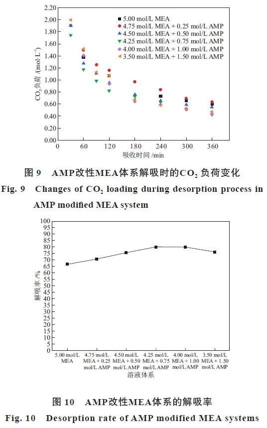 AMP的比例与体系中水的比例,影响溶液吸收产物中碳酸氢盐的比例,使碳酸氢盐更容易解吸,更快地达到较低的贫液负荷[25]。图9 和图10 分别为不同AMP比例体系的CO2 负荷随解吸时间的变化和解吸率。AMP的添加使得相同时间内,体系可达到较原始5.00 mol/L MEA体系更低的CO2 负荷,其贫液负荷有所降低。AMP的加入也增加了体系的解吸率,解吸率均高于原始5.00 mol/L MEA体系,且随着AMP量的增加,解吸率呈现先上升后下降的趋势,在AMP浓度为0.75 mol/L和1.00 mol/L时解吸率较大。在解吸方面,MEA与AMP的混合醇胺体系有着更优的解吸性能。