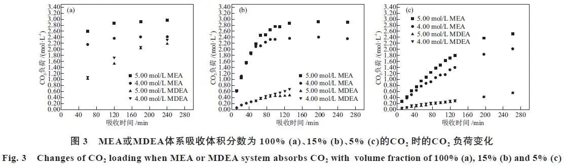 MEA和MDEA是当前工业生产中应用较多的醇胺吸收剂,图3 是MEA或MDEA单一溶剂体系在吸收不同CO2 浓度气体时,体系的CO2 负荷随时间的变化。在吸收纯CO2 时(图3(a)),5.00 mol/L MEA和4.00 mol/L MEA两种MEA体系均表现出较高的吸收速率,吸收1 h后,CO2 负荷分别可达2.60 mol/L和2.16 mol/L,分别约为饱和时溶液CO2 负荷的87.98% 和86.06%。5.00 mol/L MEA 和4.00 mol/LMDEA体系吸收1 h后,CO2 负荷分别为1.02 mol/L和1.08 mol/L,吸收速率较慢。当CO2 体积分数降低至15%时(图3(b)),5.00 mol/L MEA和4.00 mol/L MEA仍保持高吸收速率,吸收2 h后体系接近饱和,两种MDEA体系保持较低的吸收速率,远低于MEA体系。当CO2 体积分数进一步降低至5%时(图3(c)),5.00 mol/L MEA和4.00 mol/L MEA体系的吸收速率均高于两种MDEA体系。