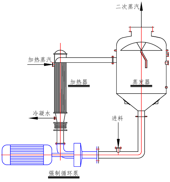 强制循环泵是使物料在蒸发器、换热器(或加热器)之间循环的设备,其适用于有结晶析出或存在易结垢成分的废水蒸发结晶系统,工艺流程如下图所示。