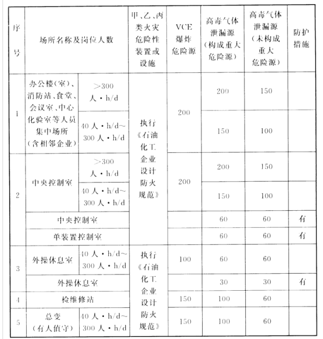 根据国际上的通用做法和我国的工程实践经验,GB 50984明确了人员集中场所相对于爆炸、有毒地点的安全距离的要求。要求人员集中场所应布置在相对安全的地段,其与具有VCE爆炸危险性和高毒气体泄漏源之间应有一定的防护距离。
