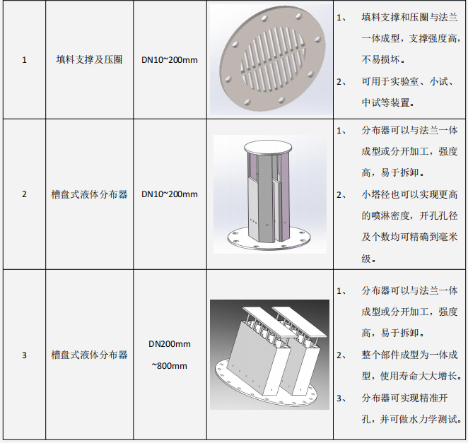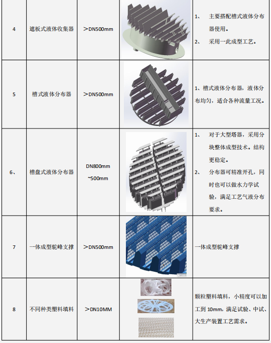 塑料内件的一体成型技术可以精确到0.1毫米,对气液的分布效率已基本接近金属内件的分布效率。内件加工尺寸可以从10毫米实验室塔径,到5米直径分布器,满足各种工况的工艺使用需求。