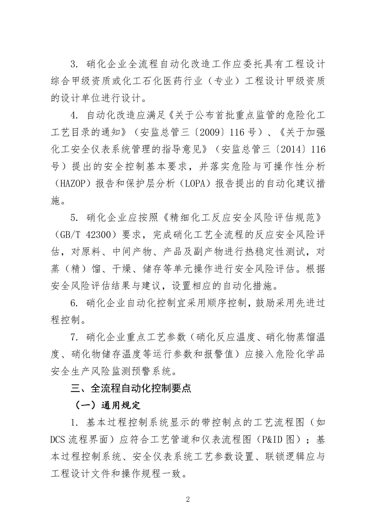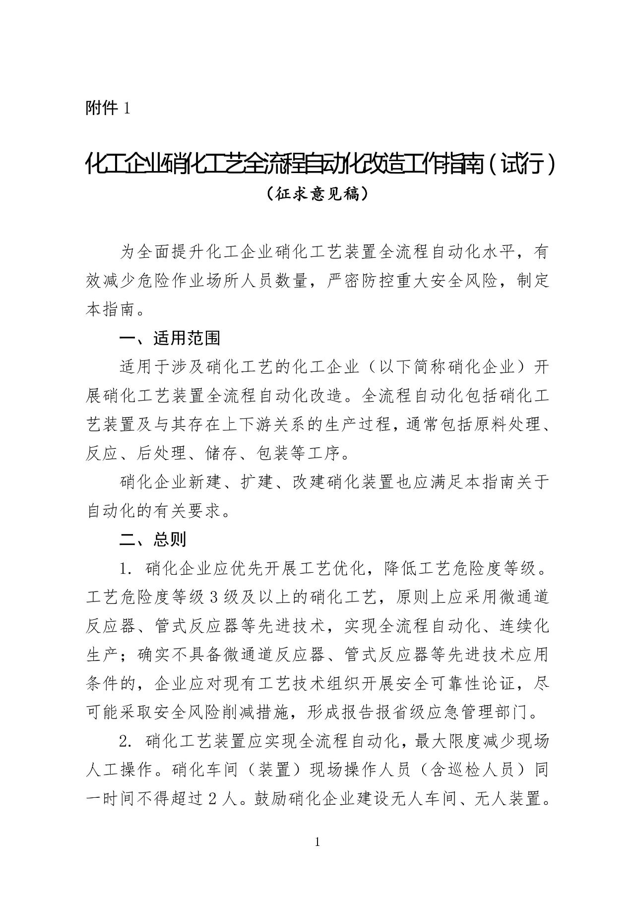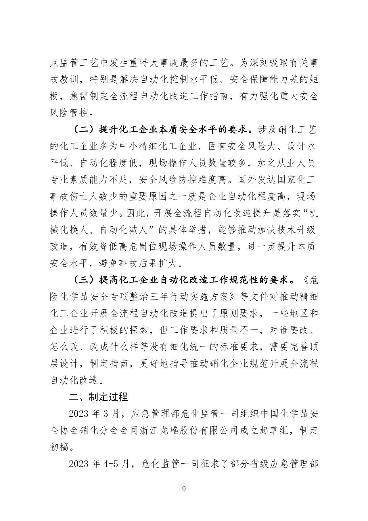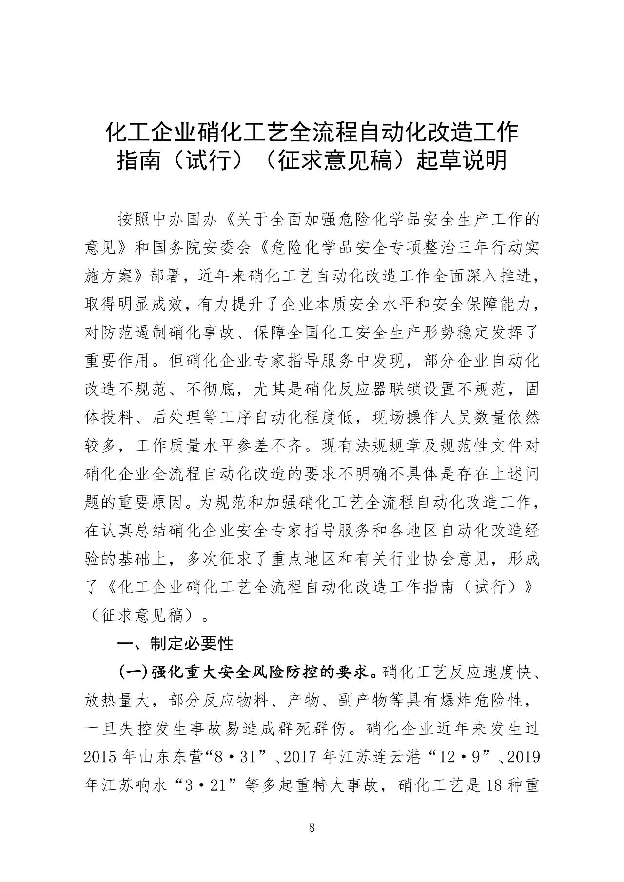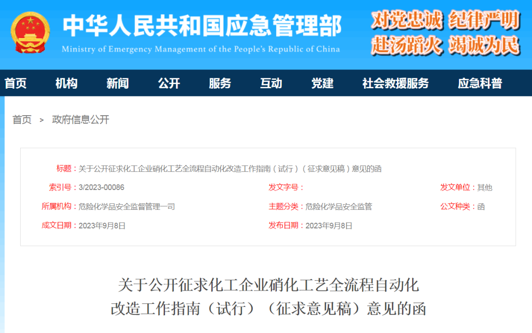 为全面提升硝化企业本质安全水平,规范和加强硝化工艺全流程自动化改造工作,进一步减少危险作业场所人员数量,有效防控重大安全风险,在吸取有关典型事故教训、认真总结三轮硝化企业安全专家指导服务和各地区自动化改造经验基础上,应急管理部危化监管一司组织编制了《化工企业硝化工艺全流程自动化改造工作指南(试行)》(征求意见稿)和起草说明。现向社会公开征求意见,征求意见截止时间为2023年10月10日。