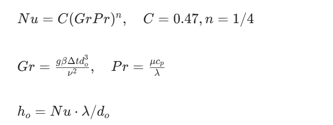 hₒ:管外介质自然对流换热系数(油品 hₒ≈150~300 W/(m²・K))