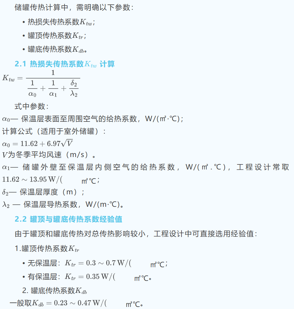 储罐容积 V、内径 D、高度 H、介质(密度 ρ、比热容 cₚ、导热系数 λ、粘度 μ、凝固点 / 维持温度 tₘ)