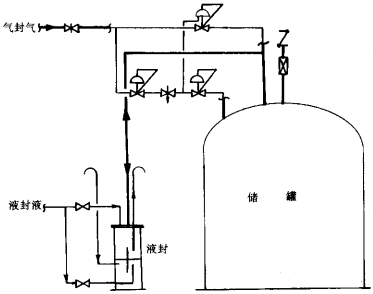 为防止泄压阀和(或)气封装置失灵而出现储罐内超压或负压情况,可采用液封和气封装置相结合的系统,其组成示意图见图2所示。