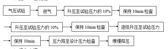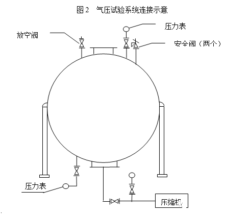 a)液压试验合格且无损检测复验也已合格,敷设临时试验管线并经现场技术人员和质量检验人员认可后,启动压缩机,首先升压至试验压力的50%,保持10min,对球罐的所有焊缝、阀门和法兰连接部位涂肥皂水或其他发泡剂作初次泄漏检查,确认无泄漏后,继续升压。