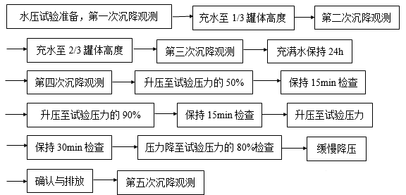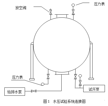 a)在球罐底部选择一个合适接管,用给水泵缓慢往球罐内充水,当水从罐顶部排气管溢流后,封闭排气管,进行升压试验,试验压力以顶部压力表读数为准。试验过程中要保持球罐外表面的干燥。充水过程中要做好基础沉降观测。