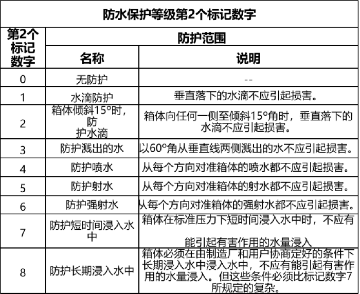 IP防护等级是由两个数字所组成,第1个数字表示电器离尘、防止外物侵入的等级,第2个数字表示电器防湿气、防水侵入的密闭程度,数字越大表示其防护等级越高。