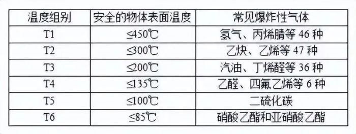 按设备最高表面温度分为T1至T6六个组,具体如下图: