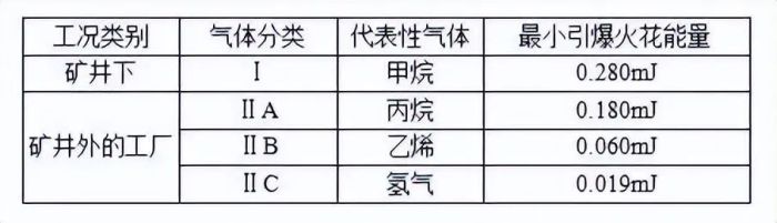 根据可能引爆的最小火花能量,我国和欧洲及世界上大部分国家和地区将爆炸性气体分为四个危险等级, 如下表 :