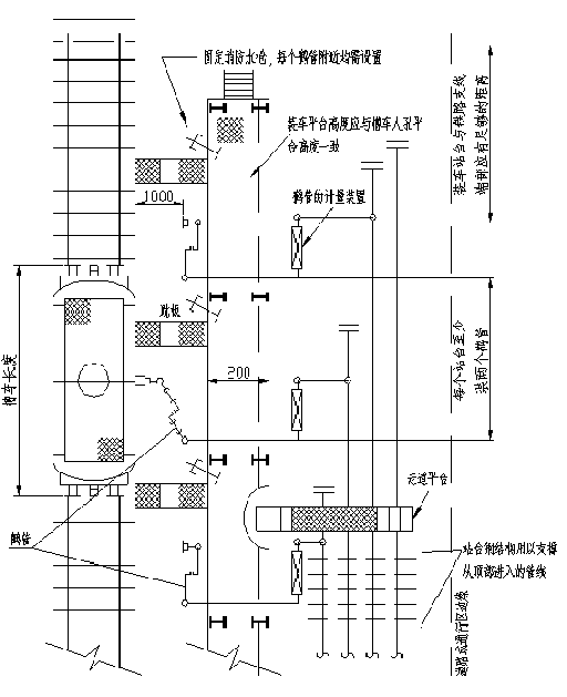 1) 装卸站总管布置与汽车槽车的型式有关。槽车的装卸口在顶部时,宜采用高架布置管道;装卸口在车的低位时,宜采用低架布置型式。