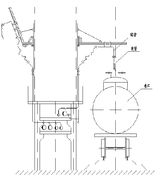 大鹤管有升降式、回转式和伸缩式。升降式鹤管通常布置在两股铁路专用线两侧;回转式鹤管布置在两专用线中间;而伸缩式鹤管则高架于每段专用线中间。鹤管的配置应确保其行程臂长,行车小车及各附件都不能与各种槽车的任何部位相碰,并能满足各种类型铁路槽车的对位灌装。