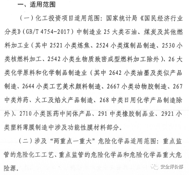 《关于规范管理全区产业园区化工项目的指导意见》:本指导意见所称化工项目,是指《国民经济行业分类(GB/T 4754-2017)》制造业门类下,石油、煤炭及其他燃料加工业、化学原料和化学制品制造业,具体包括精炼石油产品制造、煤炭加工、核燃料加工、生物质燃料加工以及基础化学原料制造、肥料制造、农药制造、涂料、油墨、颜料及类似产品制造、合成材料制造、专用化学产品制造、炸药、火工及焰火产品制造、日用化学产品制造等项目。