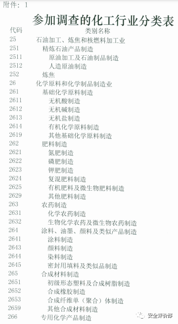 《关于开展重庆市沿江化工生产企业摸底调查的通知》(2020年)化工企业认定标准:2511原油加工及石油制品制造、2519其他原油制造、2521炼焦、2522煤制合成气生产、2523煤制液体燃料生产、2611无机酸制造、2612无机碱制造、2613无机盐制造、2614有机化学原料制造、2619其他基础化学原料制造、2621氮肥制造、2622磷肥制造、2623钾肥制造、2624复合肥料制造、2625有机肥料及微生物肥料制造、2629其他肥料制造、2631化学农药制造、2632生物化学农药及微生物农药制造、2641涂料制造、2642油墨及类似产品制造、2643工业颜料制造、2644工艺美术颜料制造、2645染料制造、2646密封用填料及类似品制造、2651初级形态塑料及合成树脂制造、2652合成橡胶制造、2653合成纤维单(聚合)体制造、2659其他合成材料制造、2661化学试剂和助剂制造、2662专项化学用品制造、2663林产化学品制造、2664文化用信息化学品制造、2665医用生产用信息化学品制造、2666环境污染处理专用药剂材料制造、2667动物胶制造、2669其他专用化学产品制造、2671炸药及火工产品制造、2672焰火鞭炮产品制造、2911轮胎制造、2912橡胶板管带制造、2913橡胶零件制造、2914再生橡胶制造、2915日用及医用橡胶制品制造、2916运动场地用塑料制造、2919其他橡胶制品制造。