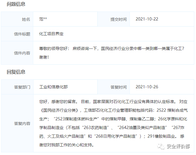 《省经济和信息化厅省发展改革委省自然资源厅省生态环境厅省应急管理厅关于加强化工项目建设管理的通知》(皖经信原材料函〔2020〕706号):本通知所称化工,包括国家统计局《国民经济行业分类》中25大类石油、煤炭及其他燃料加工业,26大类化学原料和化学制品制造业和2911轮胎制造。其中,2524煤制品制造、2530核燃料加工、2542生物质致密成型燃料加工、2625有机肥料及微生物肥料制造、2671炸药及火工产品制造、2682化妆品制造除外。