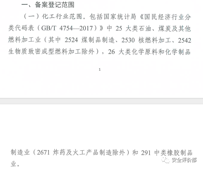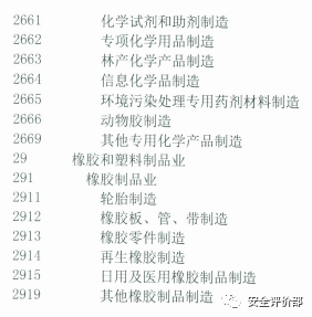 第二条 本规定所称化工行业,包括国家统计局《国民经济行业分类(GB/T 4754—2017)》中以下行业:(1)25石油、煤炭及其他燃料加工业(其中2524煤制品制造、2530核燃料加工、2542生物质致密成型燃料加工除外);(2)26化学原料和化学制品制造业(2671炸药及火工产品制造除外);(3)291橡胶制品业。