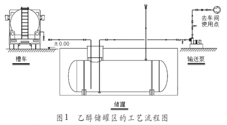 以下以某药厂的乙醇埋地罐区为例,介绍埋地储油罐的设计方法。图1为该项目的工艺流程图,乙醇通过槽车运输到埋地储油罐进行储存,然后通过泵输送到车间的各个使用点。