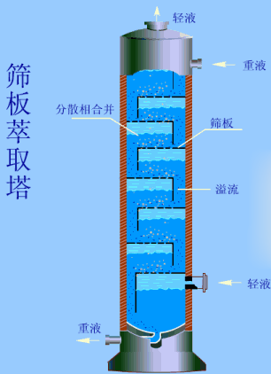 工作原理:往复筛板萃取塔又称振动筛板塔。塔内装带有许多块筛板的往复振动的中心轴的萃取设备,中心轴通过塔顶的驱动装置带动板串在塔中做垂直方向的往复运动,从而对塔内逆流流动的两液相起搅拌和分散作用。板串往复运动的振幅、频率可以调节,由于往复筛板萃取塔具有处理量大、效率高、操作弹性大和结构简单等优点而广泛运用在制药、石油化工、湿法冶金和废水处理等工业部门。
