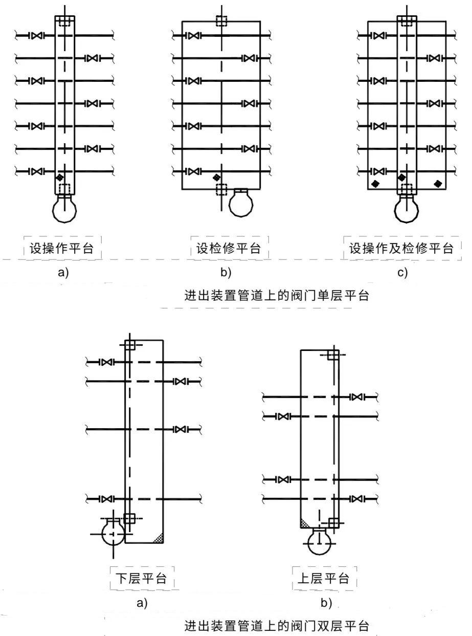 9) 除非不可避免,阀门尽可能不要布置在管廊上。管道在进出装置处通常设有切断阀和盲板。这些阀门和盲板应集中布置并设平台。由于在装置边界附近管廊上的管道数量已大大减少,因此宜将上下层合并成单层以简化平台的设计。装置边界处的单层阀门平台和双层管廊的阀门平台见下图。当平台的长度不小于8m时,应在平台的两端设直梯。