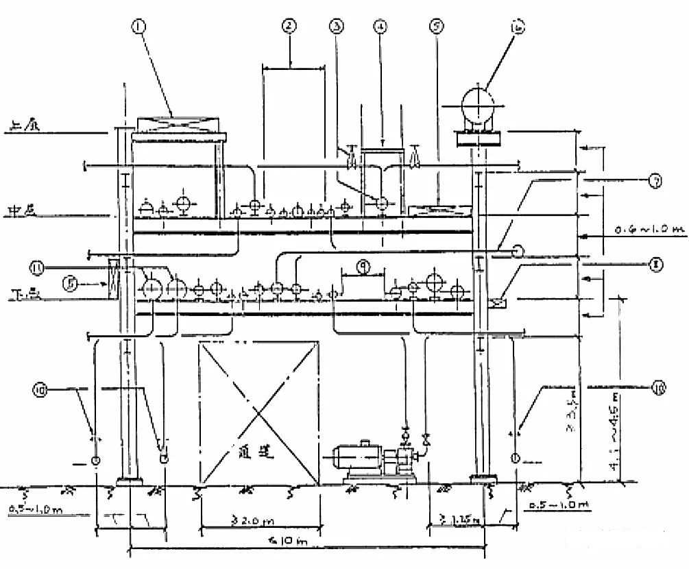 目前中型或大型石油化工装置的管廊层数不少于两层,必要时可为三层或局部三层。支管廊及小型装置的管廊可为一层。在管道比较稀疏的区段,例如在靠近装置边界处,宜将两层合并成一层以便利设置平台。