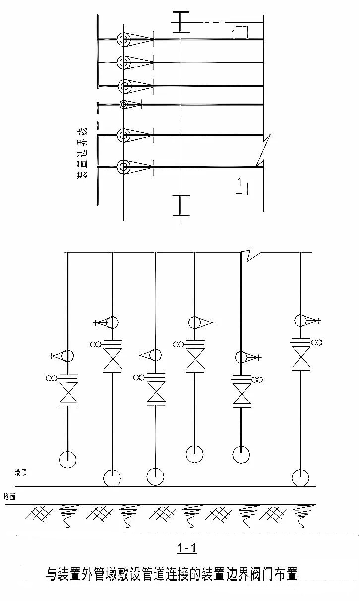 10) 当装置外工厂系统管道采用管墩敷设时,装置边界处的切断阀和盲板可采用下图的安装方法。