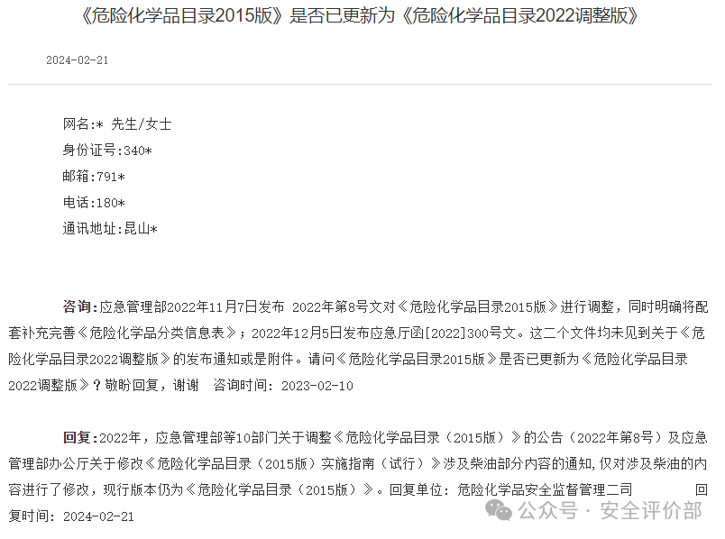 答复一、《危险化学品目录2015版》是否已更新为《危险化学品目录2022调整版》
