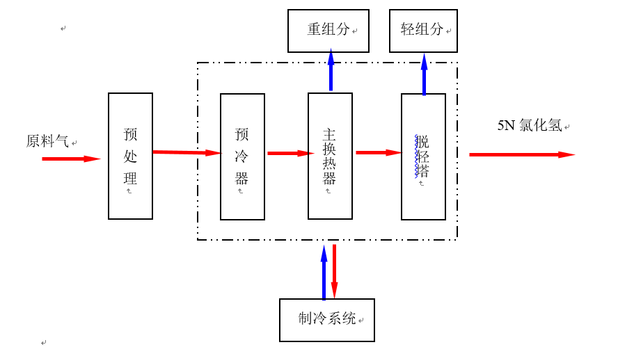 本装置的原料气为氯化氢,其中的杂质含量已经很低,为满足高 纯(5N)氯化氢的要求,预处理后的原料气进入深冷分离装置,经 过主换热器换热降温,至一定温度后进入脱重塔,脱除其中的重组分杂质;相继续冷却后进入脱轻精馏塔,通过精馏分离,塔顶采出以氢气、氮气、氯化氢为主的轻组分返回换热器复温出冷箱,塔底液相经过换热器过冷后成为 5N 级 HCL 产品。精馏塔的冷量分别由制冷 循环系统系统提供。脱重塔塔底液相及脱氢塔气相主要组分为 HCL,可返回原 3N 生产装置。