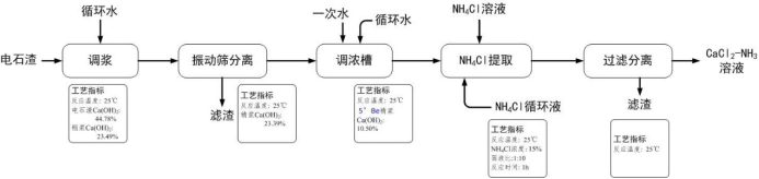 电石渣加入氯化铵溶液溶解其中氢氧化钙。提取液经重力沉降,经沉降除渣、过滤分离制得氯化钙-氨溶液。固体杂质经水洗至中性后做建材使用,洗液采用膜法回收氯化铵套用,脱除氯化铵后排水循环使用。