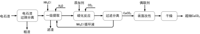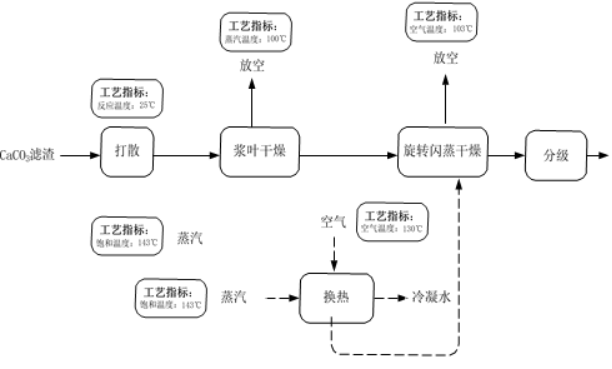 将调浓槽CaCl2料液送入碳化塔与来自回收工序的二氧化碳在塔内进行碳化反应。当塔内液体pH值达到7时,即达碳化终点,可停止送气,将料液压送至中间储槽然后用板框过滤机进行脱水,含NH4Cl的滤液经蒸发提浓后送溶解工段溶解电石渣,蒸发产生的水蒸汽水激冷凝生成高温热水用于CaCO3表面改性。
